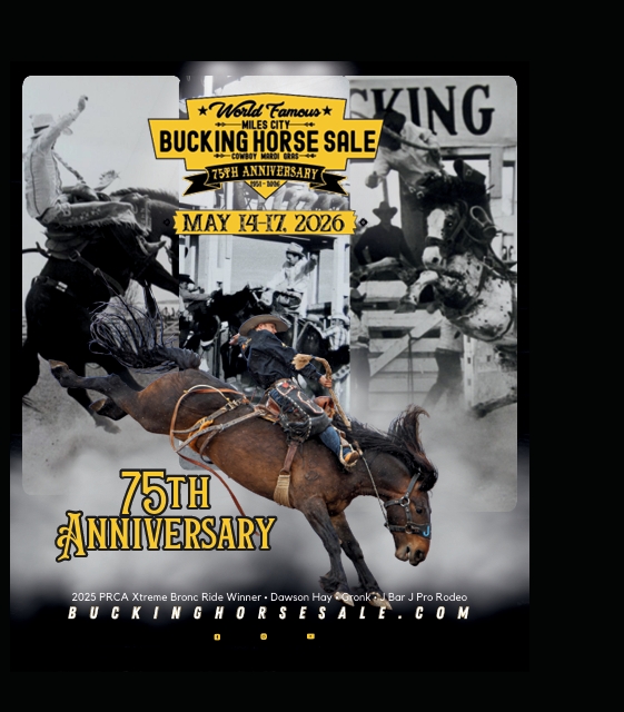 2026 Miles City Bucking Horse Sale NewsNews | Apr 26, 2026 Share this story Share Share on Facebook Share on Twitter Share on LinkedIn Share on WhatsApp Share via Email Share via SMS Copy Link More Like This, Tap A Topic miles-city-bucking-horse-sale Share this story Share Share on Facebook Share on Twitter Share on LinkedIn Share on WhatsApp Share via Email Share via SMS Copy Link Event Programs 2026 Miles City Bucking Horse Sale Apr 26, 2026 See more Trending - News Rusty Wright sets new arena record, Myles Carlson picks up biggest win of career in Fallon Apr 22, 2026 Billings BLM approves Pryor Mountain decision to remove one horse Apr 23, 2026 Thomas Ranch 54th Annual Bull Sale Apr 23, 2026 Top steer ropers take aim at National Circuit Finals Steer Roping title this weekend Apr 23, 2026 Veterinary shortage challenges livestock producers across the Northern Plains Apr 24, 2026 See more