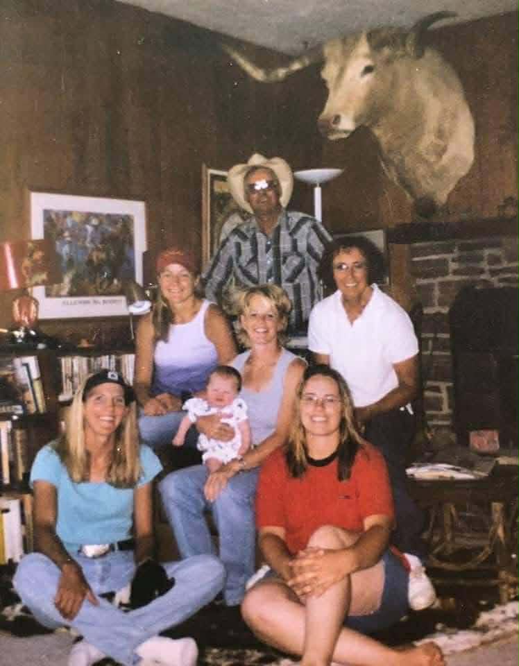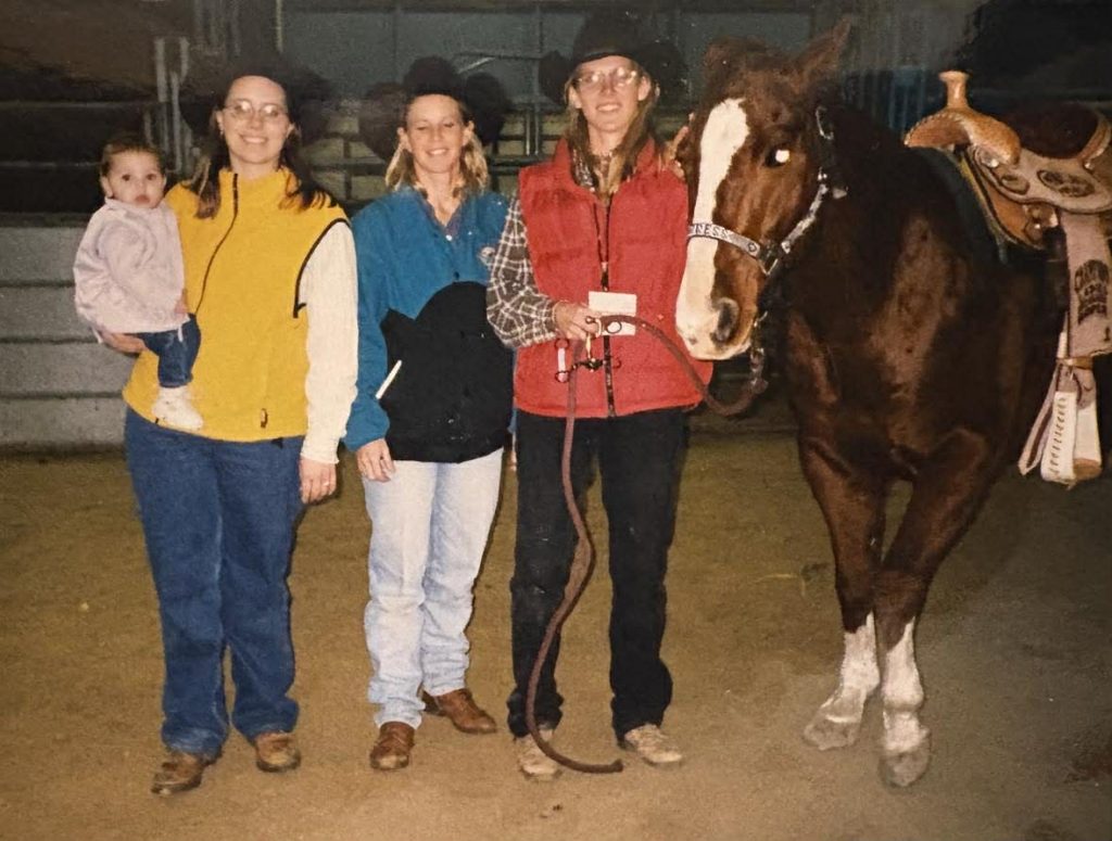 Such was the way rodeo folks traveled in the 1990s. Led by Kristi Lensegrav (Ferguson) Birkeland, the crew had a crew cab pick up and stock trailer. There were never fewer than six in the cab with seven to eight horses behind, tied nose to tail to fit them all in a single stock trailer. As there wasn’t a living quarters or even a tack room, saddles were stored in the nose with military accuracy to make sure everything would fit. And just to keep things interesting, Kristi was the goat tying director and supplied the goats at the rodeos. They were either tied in the bed of the pick up, hauled at the front of the trailer or in a pinch, simply run in loose with the horses. When they pulled into a rodeo, the whole rig exploded with people and horses, goats and saddles, boots and hats, even if they were sometimes worn backwards. The whole production once prompted Jodi Hollopeter to comment, “It’s like watching the Clampets pull into town.” Most competitors outside the trailer groaned when they pulled in, as it could be assured they would be taking a large portion of the pot home when the lights were shut down. Their philosophy was to work hard so they could play when the rodeo was over. But let it be known, they weren’t there just to slack off and have fun. First and foremost, they were there to compete and to win.