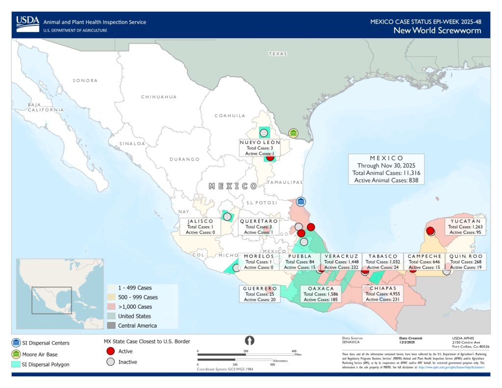 On Dec. 3, 2025, the Texas Department of Agriculture reported in a press release that the U.S. Department of Agriculture had notified them of a new detection of the New World Screwworm (NWS) in Montemorelos, Nuevo León, Mexico, approximately 120 miles south of the Texas border. USDA’s Animal and Plant Health Inspection Service (APHIS) confirmed the case in a 22-month-old bovine transported from Veracruz to a feedlot in Nuevo León.