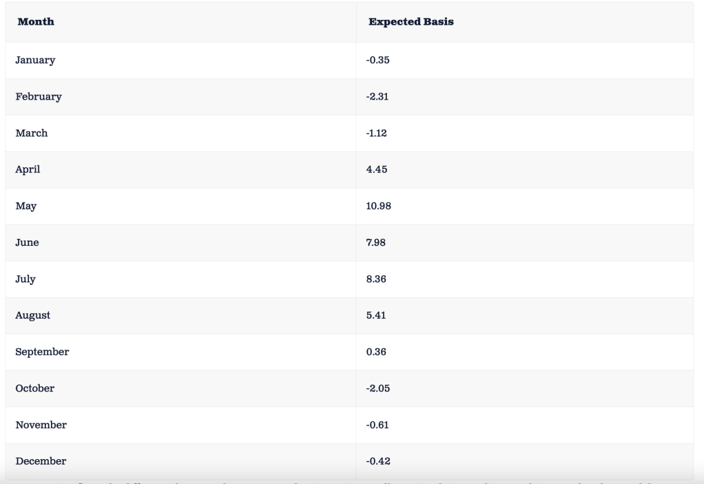The expected basis varies by month and can be added to observed futures contracts arriving at expected cash prices. The expected basis early and late in the year suggests the cash price would be less than the futures price, with a difference consistent with transportation costs between Worthing, South Dakota and slaughter facilities. The large basis in May reflects the historic seasonal high in May ahead of the lower price in June.