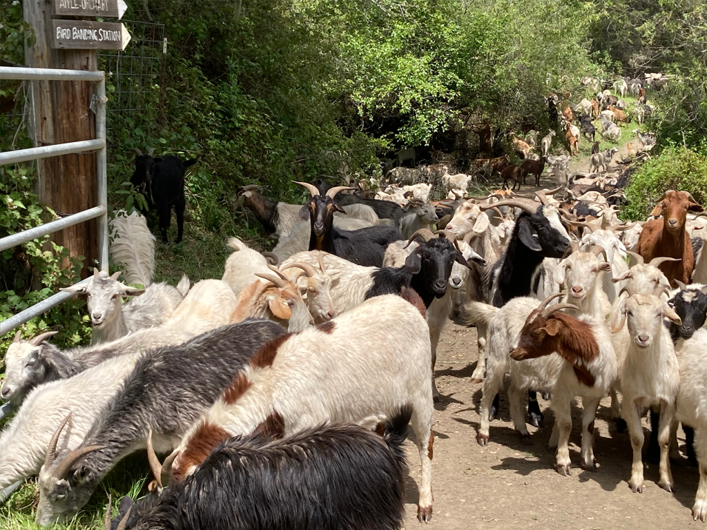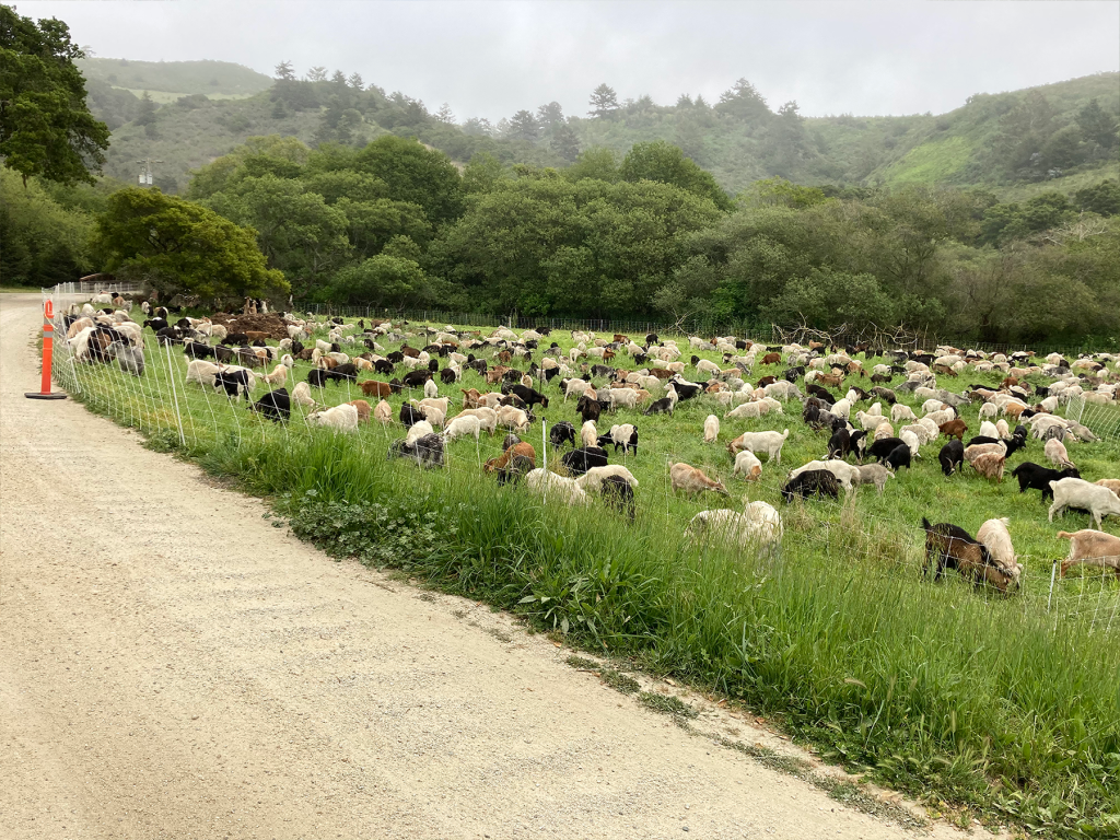 This herd started off with 100 goats and has now grown to consist of over 1,200, mostly of the Cashmere (also known as Spanish) type. These goats eat down vegetation in whatever area they are taken to with the goal of weed management, brush control, restoration and re-seeding, flood control and fire mitigation.