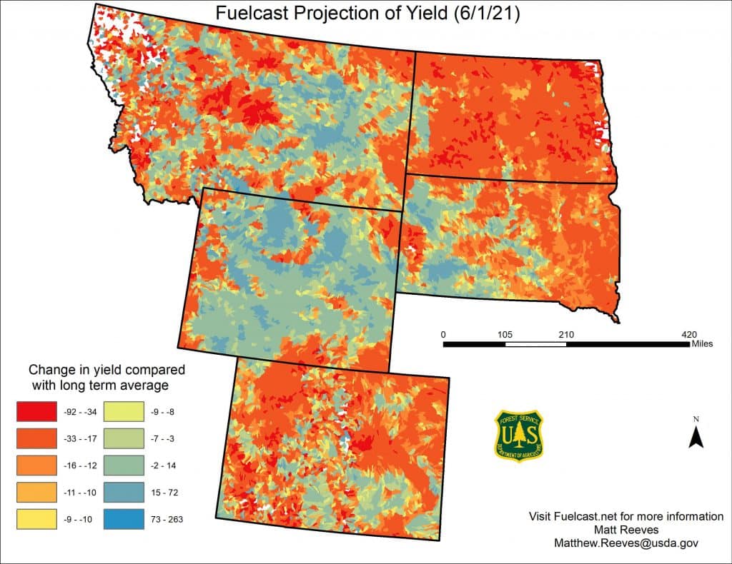 “In South Dakota, the north and eastern parts appear to be the most hard hit with losses about 25 – 35 percent on average. The Black Hills is also expected to see reduced yields of 15 – 20 percent but with ample standing dead from a good grass crop last year, wildfire remains a concern.