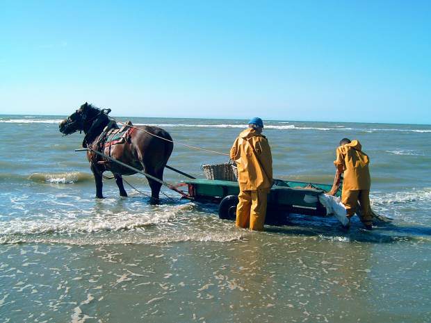 Shrimp fishing takes place twice a week, every week of the year. The fisherman drop their carts on the shore and prepare their nets: the horses drag a pair of boards which open the nets in the water, as well as a chain which drags the sea floor (and, of course, the horses carry the fishermen on their backs.) Vibrations from the chain scare the shrimp into the nets. The process is less damaging to the coast than traditional shrimp trawling which can severely tear up the sea floor. When the nets are full, the fishermen and horses trudge back to the beach, where the catch is sorted. On certain days the shrimpers cook parts of their catch right on the beach and sell cooked shrimp directly to throngs of tourists who have gathered to watch the entire process as a live exhibit. Most of the time, the fishermen pull their catches back home via horse cart to cook and sell out of their houses. The fishing process takes place an hour before and an hour after low tide.